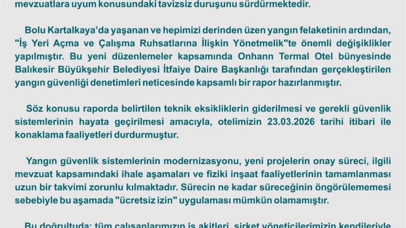 Söz konusu raporda belirtilen teknik eksikliklerin giderilmesi ve gerekli güvenlik sistemlerinin hayata geçirilmesi amacıyla, otelimizin 23.03.2026 tarihi itibari ile konaklama faaliyetleri durdurmuştur.
